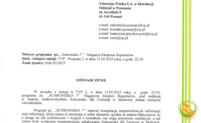 Już sam zwiastun programu opublikowany w mediach społecznościowych wskazywał na to, iż program ten będzie nierzetelny, dlatego też jeszcze przed jego emisją zostało skierowane do Państwa Oświadczenie datowane na dzień 11 lutego 2025 roku, wzywające do: zawieszenia emisji programu; niezwłocznego usunięcia zwiastuna z profilu Facebook oraz innych kanałów informacyjnych, w tym mediów społecznościowych; uzupełnienia materiału, który zostanie wyemitowany o stanowisko Schroniska w sprawach, w których pojawiają się zarzuty formułowane przez dwie ww. Panie oraz do uzupełnienia materiału, który zostanie wyemitowany o pełne (a nie jak się podczas emisji programu okazało - wyrwane z kontekstu) stanowisko Powiatowego