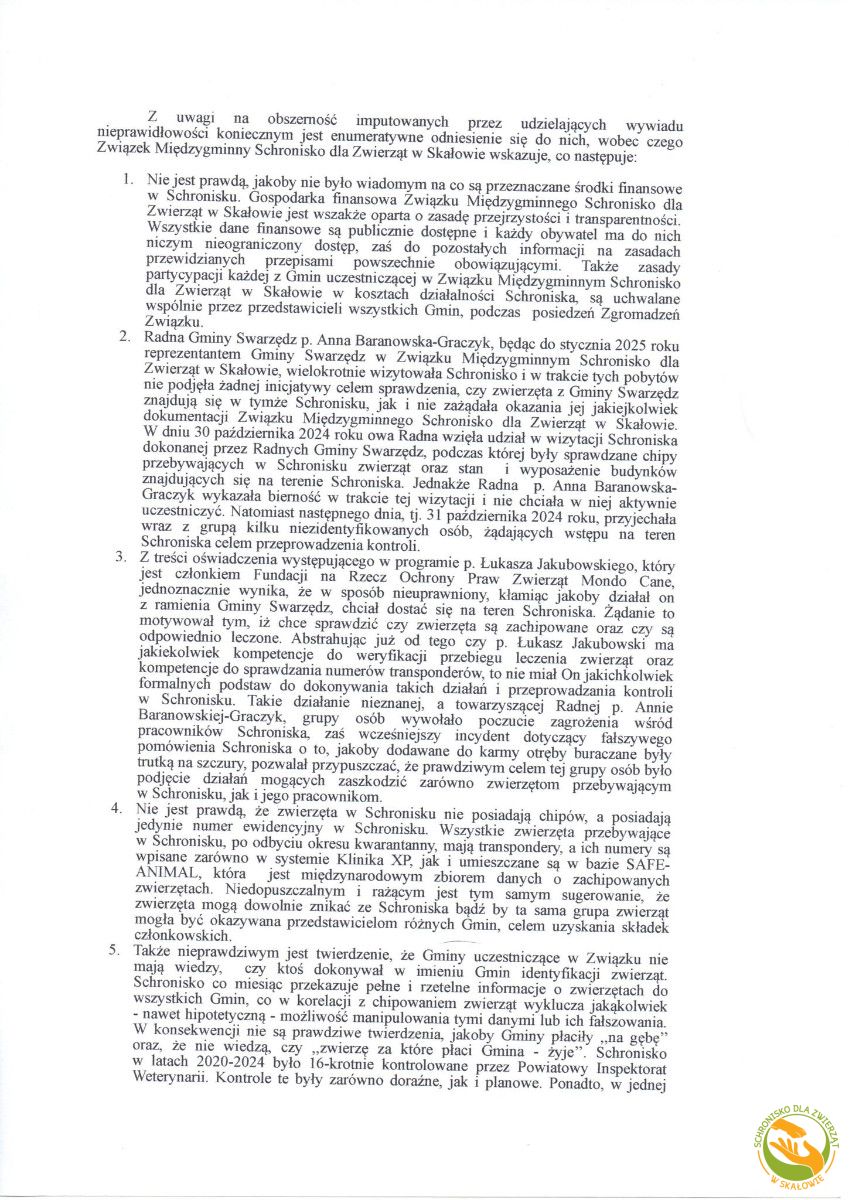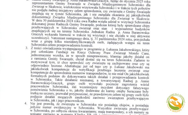 2. Radna Gminy Swarzędz p. Anna Baranowska-Graczyk, będąc do stycznia 2025 roku reprezentantem Gminy Swarzędz w Związku Międzygminnym Schronisko dla Zwierząt w Skałowie, wielokrotnie wizytowała Schronisko i w trakcie tych pobytów nie podjęła żadnej inicjatywy celem sprawdzenia, czy zwierzęta z Gminy Swarzędz znajdują się w tymże Schronisku, jak i nie zażądała okazania jej jakiejkolwiek dokumentacji Związku Międzygminnego Schronisko dla Zwierząt w Skałowie. W dniu 30 października 2024 roku owa Radna wzięła udział w wizytacji Schroniska dokonanej przez Radnych Gminy Swarzędz, podczas której były sprawdzane chipy przebywających w Schronisku zwierząt oraz stan i wyposażenie budynków znajdujących się na terenie Schroniska. Jednakże Radna p. Anna Baranowska-Graczyk wykazała bierność w trakcie tej wizytacji i nie chciała w niej aktywnie uczestniczyć. Natomiast następnego dnia, tj. 31 października 2024 roku, przyjechała wraz z grupą kilku niezidentyfikowanych osób, żądających wstępu na teren Schroniska celem przeprowadzenia kontroli.