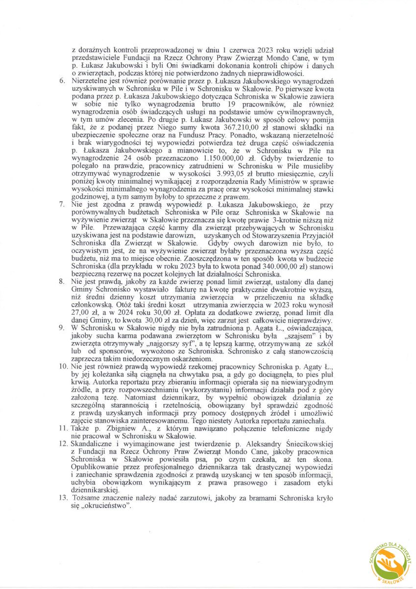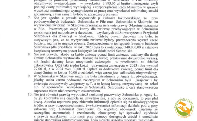7. Nie jest zgodna z prawdą wypowiedź p. Łukasza Jakubowskiego, że przy porównywalnych budżetach Schroniska w Pile oraz Schroniska w Skałowie na wyżywienie zwierząt w Skałowie przeznacza się kwotę prawie 3-krotnie niższą niż w Pile. Przeważająca część karmy dla zwierząt przebywających w Schronisku uzyskiwana jest na podstawie darowizn, uzyskanych od Stowarzyszenia Przyjaciół Schroniska dla Zwierząt w Skałowie. Gdyby owych darowizn nie było, to oczywistym jest, że na wyżywienie zwierząt byłaby przeznaczona wyższa część budżetu, niż ma to miejsce obecnie. Zaoszczędzona w ten sposób kwota w budżecie Schroniska (dla przykładu w roku 2023 była to kwota ponad 340.000,00 zł) stanowi bezpieczną rezerwę na poczet kolejnych lat działalności Schroniska.