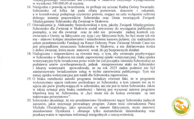 17. Oświadczenie p. Aleksandry Śniecikowskiej o tym, jakoby Związek Międzygminny Schronisko dla Zwierząt w Skałowie został utworzony do wyciągania publicznych pieniędzy, a nie dla zwierząt oraz że nikt nie prowadzi żadnej kontroli czy zwierzęta z Gminy są faktycznie czy żyją i czy faktycznie były, bo być może ich nie ma - stanowi kolejne zniesławienie i nieuchronnie nasuwa pytanie, czy nadrzędnym celem przedstawicielki Fundacji na Rzecz Ochrony Praw Zwierząt Mondo Cane nie jest przypadkiem zniszczenie Schroniska w Skałowie, a nie deklarowana troska o dobro zwierząt, która może stanowić woal, do jej bezprawnych działań.