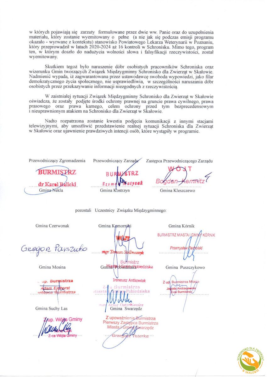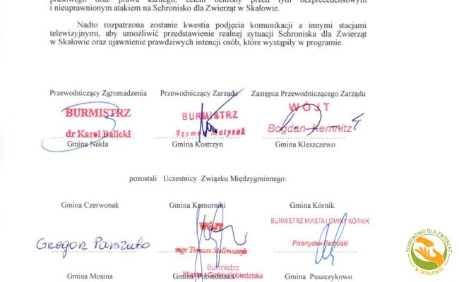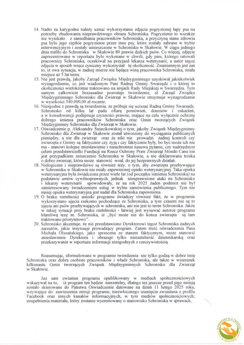 W zaistniałej sytuacji Związek Międzygminny Schronisko dla Zwierząt w Skałowie oświadcza, że zostały podjęte środki ochrony prawnej na gruncie prawa cywilnego, prawa prasowego oraz prawa karnego, celem ochrony przed tym bezprecedensowym i nieuprawnionym atakiem na Schronisko dla Zwierząt w Skałowie.