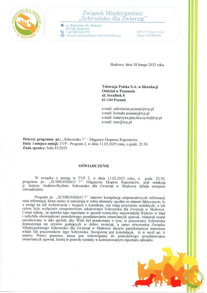 W związku z emisją w TVP 2, w dniu 11.02.2025 roku, o godz. 22:30, programu pt.: ,,SCHRONISKO ?’’ Magazynu Ekspres Reporterów, pod redakcją p. Justyny Andersz-Rychter, Schronisko dla Zwierząt w Skałowie składa niniejsze oświadczenie.