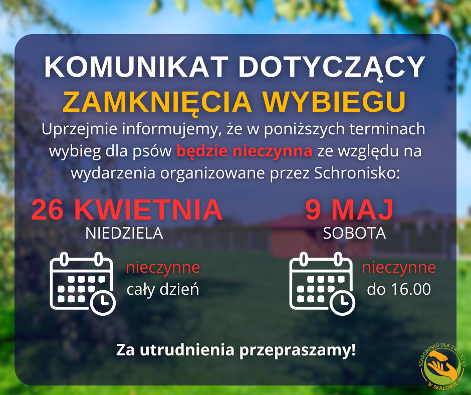 Dnia 26 kwietnia, oraz 9 maja do godziny 16.00 wybieg dla psów będzie nieczynny.