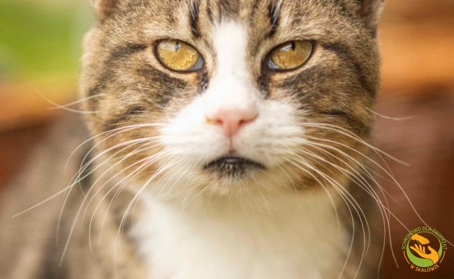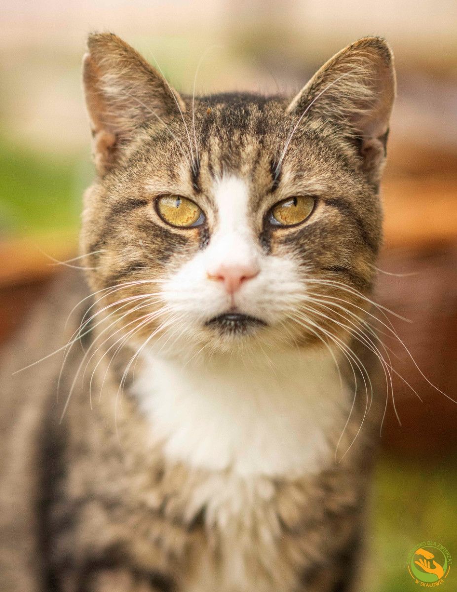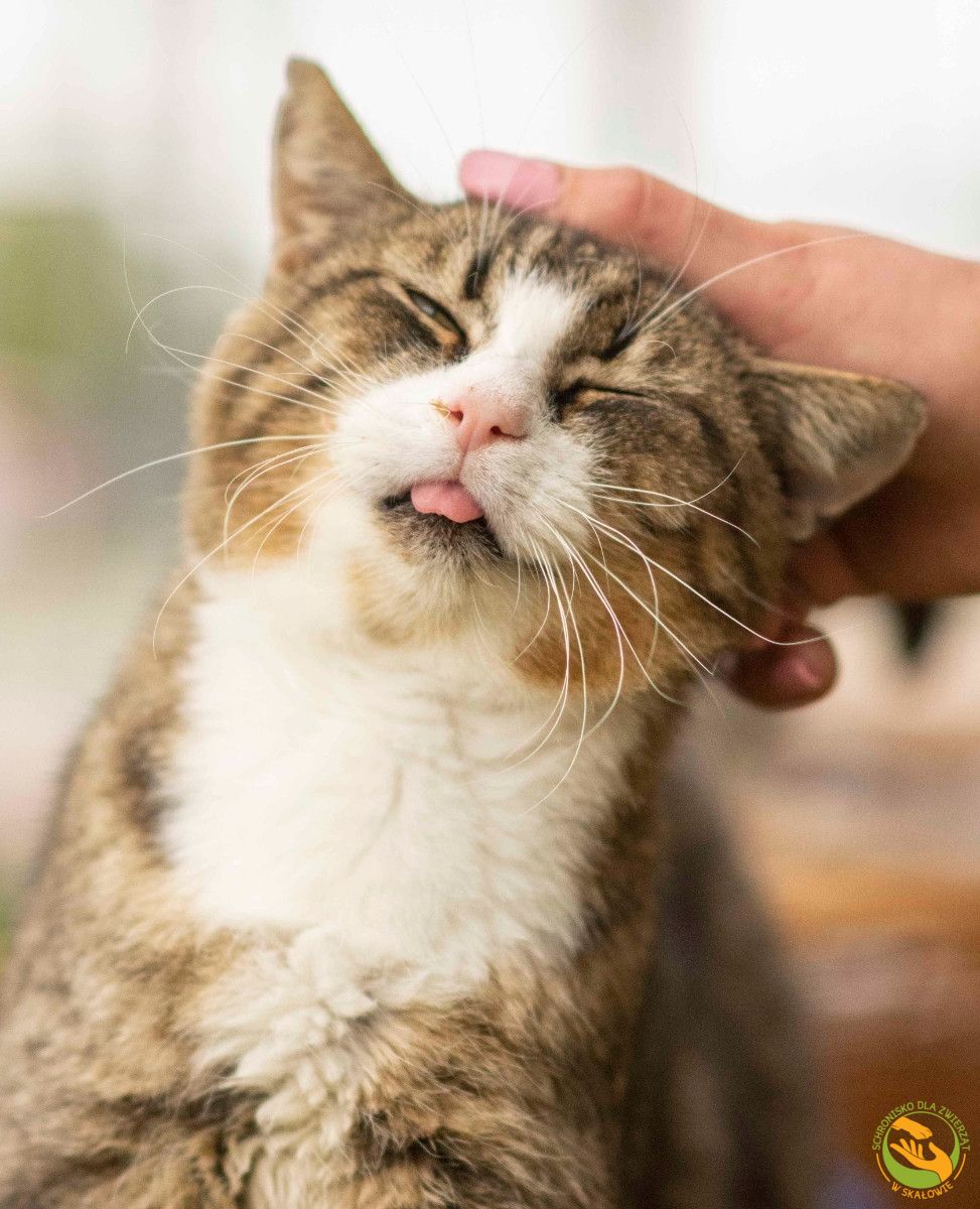 Dziś to zupełnie inny kot. Spokojny, zrównoważony, z tą mądrą kocią godnością, jakby chciał powiedzieć: „tak, byłem na dnie – ale wyszedłem z tego”. Uwielbia ludzi, łasi się, wskakuje na kolana, jakby chciał nadrobić wszystkie lata, kiedy nikt go nie głaskał.